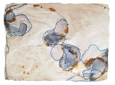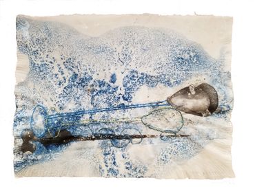 Nancy Cohen draws, too, but with paper pulp on handmade paper sheets. She calls them pulp drawings, and many approach 8 feet square and often refer to her 3D pieces. Tomomi Ono rubs oily crayon onto a  stone she has ground to perfect flatness.  Then she treats the stone chemically with a mixture of nitric acid and gum Arabic to stabilize the image for printing. She removes the drawing mediums from the stone with solvent and replaces them with ink. And then she rolls oil based ink over it after sponging the surface with water, which is repelled by her marks, allowing the ink to stick there. She uses a press to squeeze paper to the stone, creating a lithographic print.